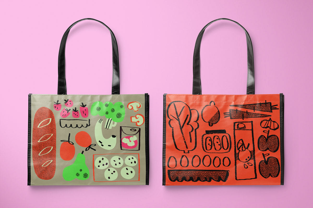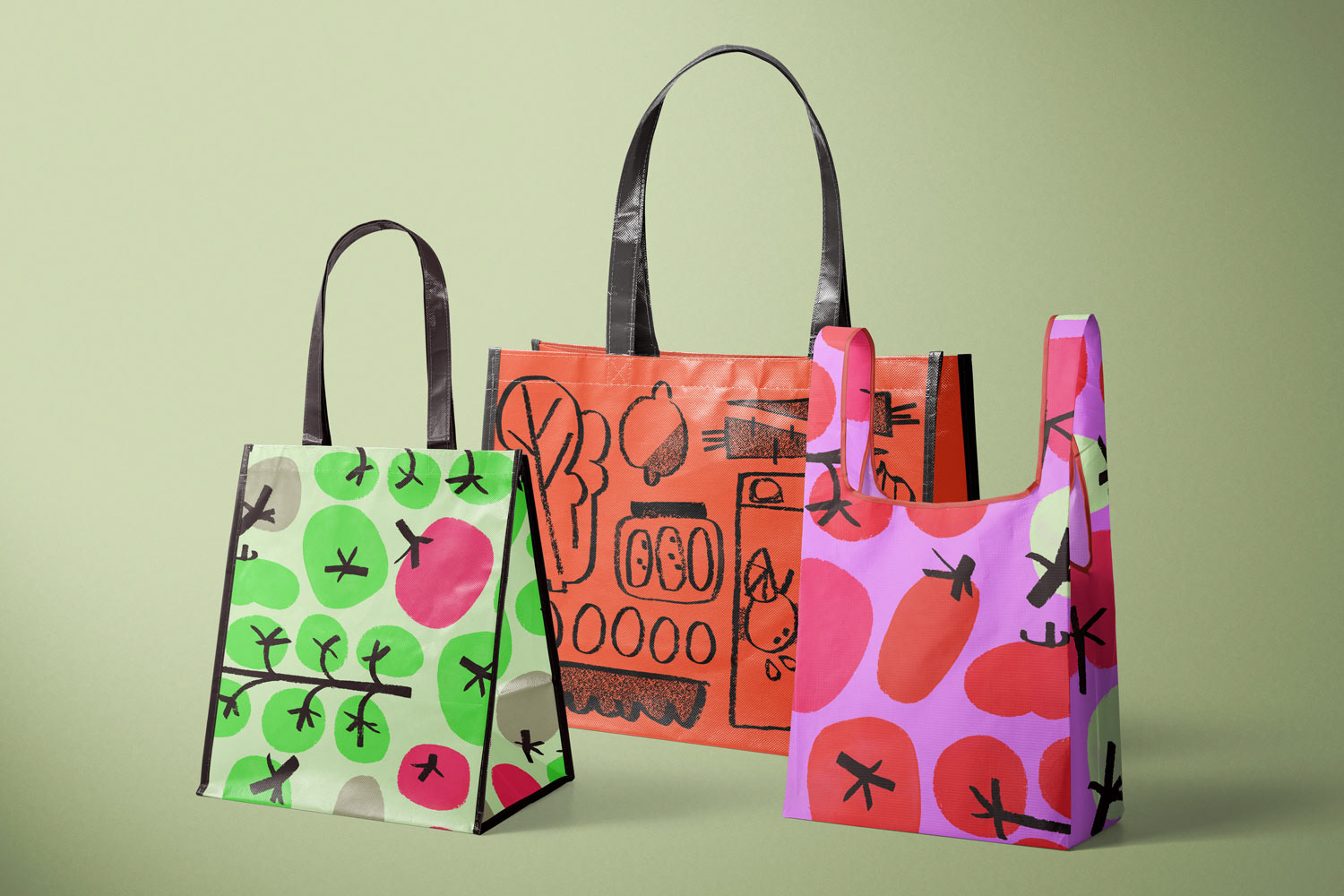 I designed this collection with the idea of creating attractive shopping bags that could double as fashion accessories, thereby encouraging regular use. For this reason, I selected a bold, limited color palette and striking graphic designs.