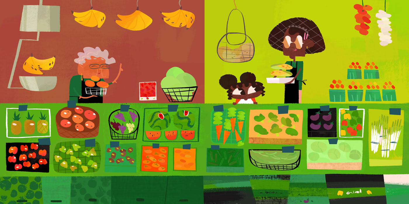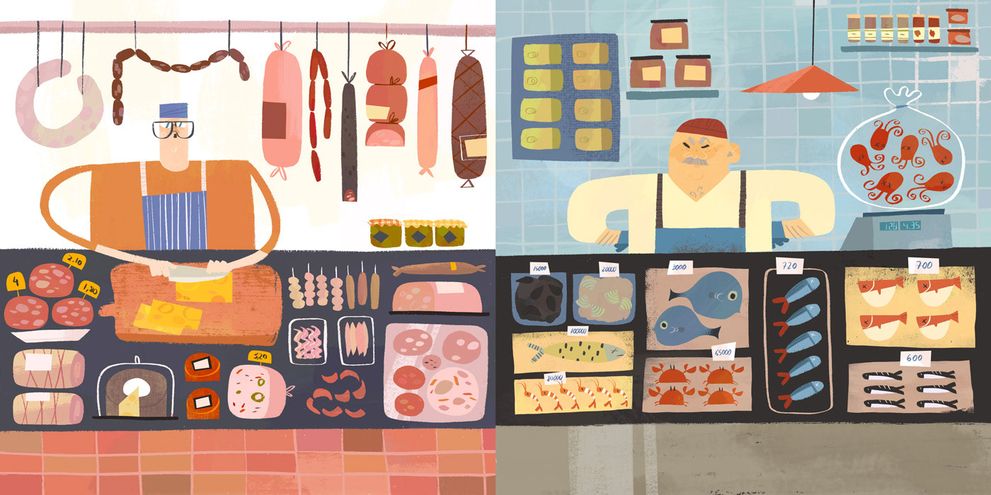 Let's go do groceries at the market! Will you find everything on these pages? Kids will learn which things you can buy in each shop at the market.